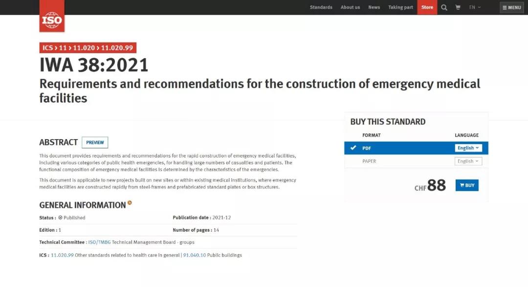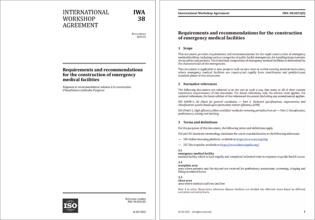 2021年12月20日,国际标准化组织(ISO)官方网站正式发布了华体会(中国)牵头提出的国际研讨会协议IWA 38《应急医疗设施建设导则》(以下简称“《导则》”)。
