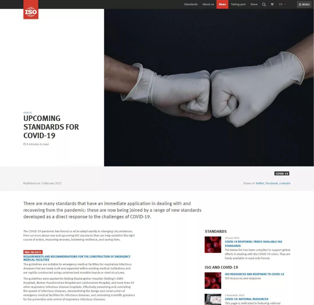 在此新冠肺炎疫情持续蔓延、亟待国际合作共同抗击疫情之际,IWA 38《应急医疗设施建设导则》作为ISO应对新冠肺炎疫情的系列标准之一先行发布,为世界各国安全、适用、快速建设应急医疗设施提供了有力的技术支持,为中国乃至世界人类健康事业作出了巨大的贡献。